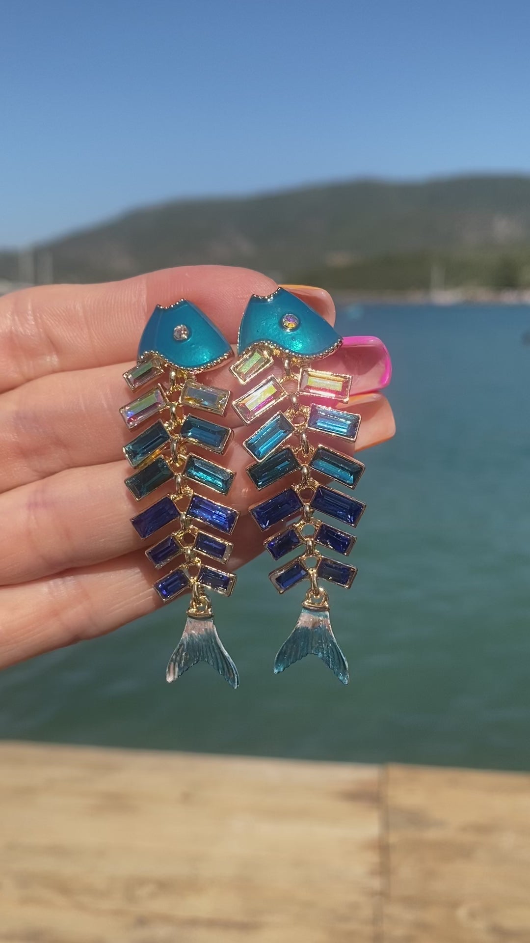 Renkli kristal taşlar ve mineli balık küpe.!8 ayar altın kaplamadır.6,5 cm yüksekliğindedir.