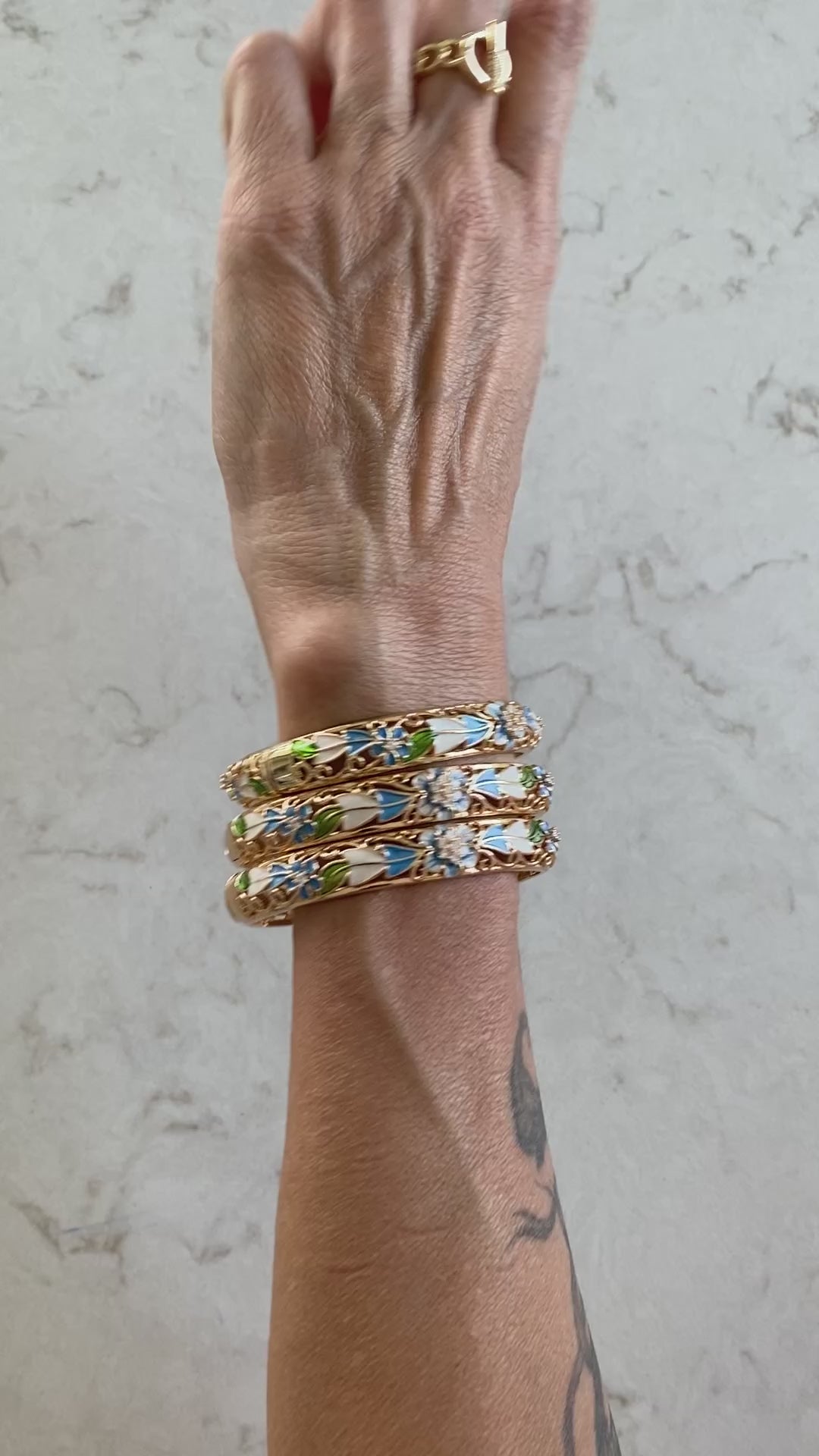 Mineli,çiçeklerle bezeli,kelepçe bileklik.Altın kaplama ve minelidir.