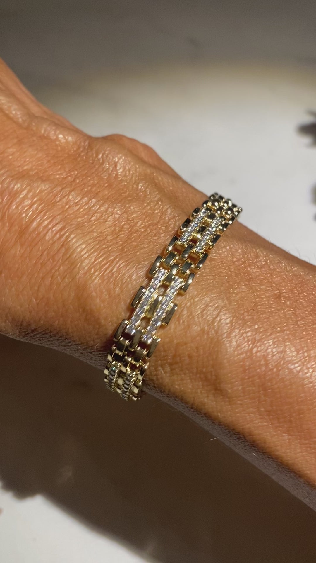 22 ayar mikron altın kaplama,kafes desenli klasik bileklik.3 sıralı pave zirkon taşlı ve ayarlı klipslidir.(Ayarlı klipsle 17-19 cm aralığında olabilmektedir)