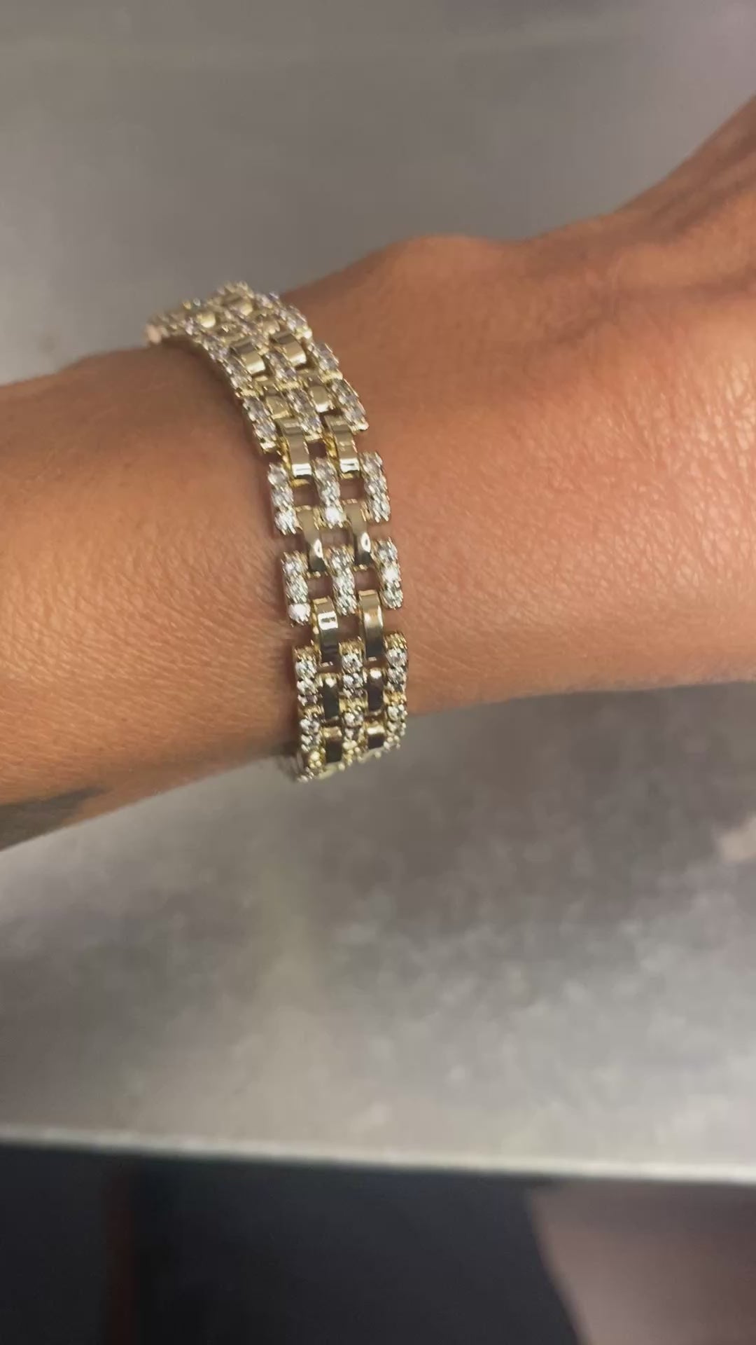 Full pave zirkon taşlı,tam tur ışıl ışıl kafes dizayn bileklik. Kuyumcu işçiliği ile yapılmıştır, 22 ayar mikron altın kaplamadır.Klipsinde ayarı vardır her ölçü bileğe uyar.